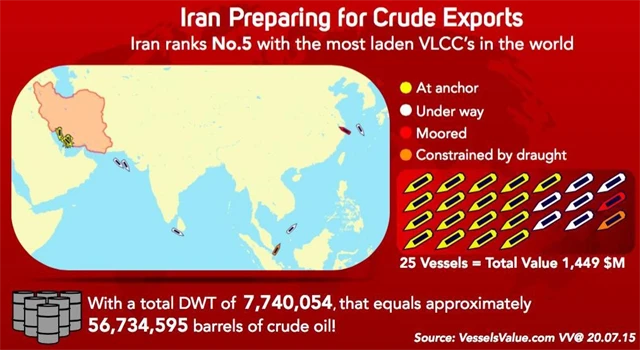 Íránský ministr ropného průmyslu Roknáddín Džavádí tvrdí, že má Teherán k okamžité expedici v tankerech na moři připraveno kolem deseti milionů barelů ropy. Čeká se podle něj jen na to, až dojde k oficiálnímu zrušení sankcí. Jak se ale postupně ukazuje, surovina, kterou má Írán na moři v zásobě, je jen ropný kondenzát (směs uhlovodíků získaných při těžbě zemního plynu) nižší kvality, který kvalitní ropu nahradit nedokáže.