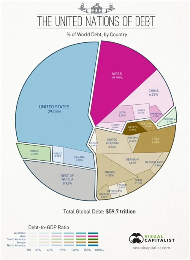 Největším věřitelem světových vlád jsou s velkým náskokem USA, které drží celkem téměř 30 % globálních vládních dluhů. Druhé v pořadí je Japonsko, které drží téměř pětinu světových státních dluhů, a na třetím místě je Čína, jež sedí na více než šesti procentech dluhů emitovaných světovými vládami.