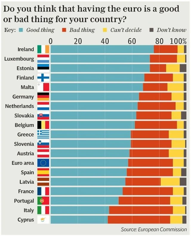 Výjimkami jsou podle průzkumů Itálie a Kypr. Paradoxně i většina Řeků považuje euro za dobré pro ekonomiku. Víra v měnu je nejsilnější v Irsku, což je také pozoruhodné vzhledem k tomu, co si země vytrpěla, když bylo ponechána napospas politickému konsenzu eurozóny.