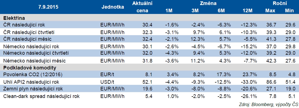 V průběhu srpna došlo po sérii výprodejů k dalšímu propadu cen elektřiny, když cena na německém trhu dosáhla 12letého minima. Cena české elektřiny dosáhla dna 24. srpna, když se Cal16 baseload future obchodoval za 29,65 EUR/MWh. Koncem měsíce došlo k mírné korekci vzhůru, v současnosti cena Cal16 kontraktu pohybuje kolem 30,00 EUR/MWh.