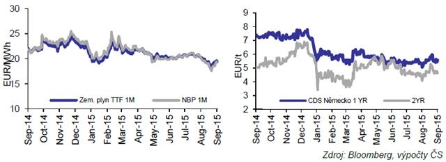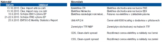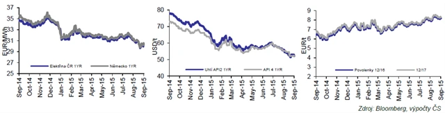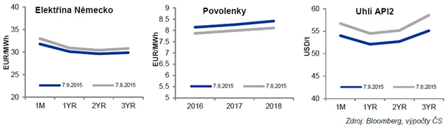 V krátkodobém výhledu několika měsíců předpokládáme mírné oživení cen elektřiny díky sezónnímu oživení na trhu komodit a předpokládanému obnovování zásob uhlí v Číně. Ceny v eurech by mělo podporovat také fundamentální posilování amerického dolaru. U povolenek není na obzoru žádné významné datum, takže by měly pokračovat v dlouhodobém mírně rostoucím trendu. Spready budou v nejbližší době reagovat hlavně na makrodata z EU. Střednědobě budou zdražující povolenky (asi 25 % ceny elektřiny) a očekávané postupné zlepšování spreadů (15 % ceny) stále svádět boj se slabými, i když už výrazně stlačenými cenami uhlí (60 % ceny). V dlouhodobém výhledu (po roce 2018) by z našeho pohledu měly být normalizované ceny elektřiny (při stabilních cenách uhlí) alespoň 15 EUR/MWh nad aktuálními cenami, aby bylo možné udržet v chodu černouhelné elektrárny jako marginální zdroj (při předpokládaném postupném zavírání hnědouhelných provozů). Ceny černého uhlí jsou ale ve strukturálním poklesu, a mohou tak z tohoto potenciálu část ubrat.