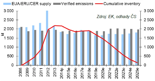 Ani nedávný nárůst cen povolenek (okolo 8 EUR) stále nikoho nenutí přecházet na čistější zdroje, v dlouhodobém horizontu (po roce 2018) by ale mohly opět začít plnit svoji úlohu. Cenu povolenky nutnou pro přechod z hnědého uhlí na černé uhlí odhadujeme na 20-25 EUR, cenu pro přechod z černého uhlí na zemní plyn pak na 35-40 EUR. Přebytek povolenek by po roce 2020 měl klesnout až k nule.
