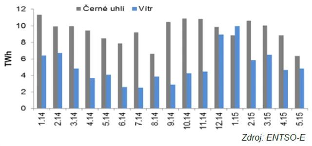 V kontrastu s klesající spotřebou se produkce elektřiny v Německu za prvních pět měsíců zvedla o 0,7 %, takže exporty pokračovaly v růstu. Částečně je oživení produkce dáno lepší hydrologickou situací, většina jde ale na vrub dokončování mořských větrných parků. Začala sice klesat produkce z černouhelných elektráren (-9 %), ne ale zatím dostatečně rychle na srovnání vývoje spotřeby a výroby. Tento stav bude vzhledem k rychlejšímu než původně očekávanému dokončování mořských větrných parků letos a příští rok trvat.