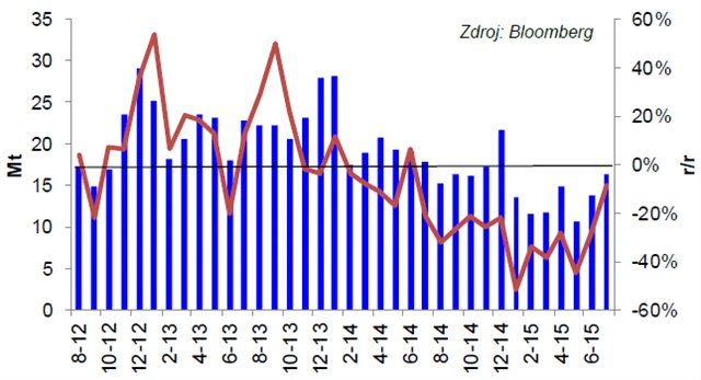 Dobré zprávy v poslední době nechodí ani z Indie, kterou hráči na uhelném trhu vidí jako možného zachránce. Indické importy za pololetí sice vzrostly o 23 milionů tun, v červenci ale meziročně klesly o 11 %. Indická vláda oficiálně očekává za celý rok pokles dovozů o 3 % (6 milionů tun). Světýlkem na konci tunelu je snad alespoň letní zlepšení čínských dovozů do blízkosti meziroční nuly z důvodu poklesu produkce z domácích dolů a díky příznivějšímu počasí.