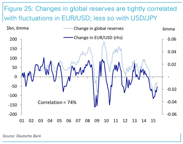 Jak se centrální banky snaží bránit své měny vůči dolaru, musejí prodávat také ostatní měny, aby své FX alokace udržely stabilní. Fluktuace eurodolaru jsou silně korelované se změnami světových rezerv. Je však potřeba mít na paměti, že tato korelace (logicky) funguje v obou směrech.
