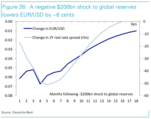 Deutsche Bank poskytuje návod, jak "hrát" případné QT na trzích. Skutečnost, že jsou dvě třetiny světových rezerv denominovány v dolarech, napovídá tomu, že by mohly být výprodeje pozitivní zprávou pro americký dolar ve srovnání s ostatními měnami.