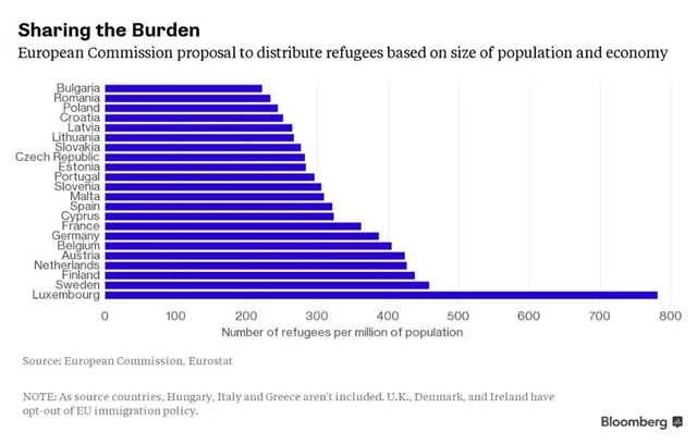 Komise vzala při propočtech v úvahu faktory, jako jsou velikost země a její ekonomická síla. EU by se podle ní měla o migranty podělit následovně: