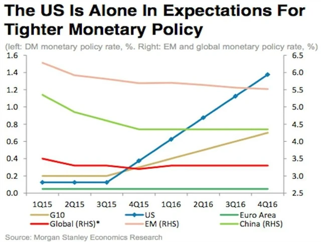 Jak ale ukazuje nejen graf z dílny Morgan Stanley, i ten nejmenší posun sazeb v USA v příštích kvartálech udělá z USA v rámci velkých vyspělých zemí doslova opuštěný ostrov. A mimochodem, Fed by předpokládanou cestou zvyšování sazeb šel i proti celkovému trendu na mladých trzích.