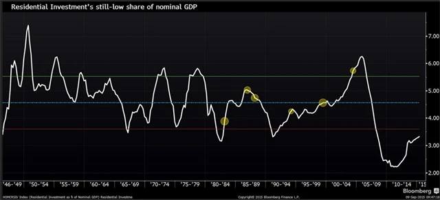 Fed nespustil cyklus zvyšování sazeb v prostředí, v němž jsou rezidenční investice jako podíl na HDP o více než jednu směrodatnou odchylku pod dlouhodobým průměrem, minimálně od roku 1970. "V době, kdy jsou rezidenční investice jako podíl na HDP nízké, ekonomika zpravidla přechází do fáze expanze," píše Doyle. "Recese vznikají až ve chvíli, kdy je poměr rezidenčních investic k HDP zvýšený."