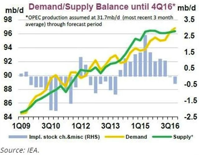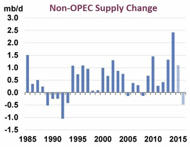 Mezinárodní agentura pro energii předpovídá, že nízké ceny ropy budou k omezování těžby v následujících měsících a čtvrtletích tlačit další firmy, což trh vrátí do rovnováhy v druhé polovině příštího roku. IEA dokonce tvrdí, že by se trh mohl z výrazného převisu nabídky nad poptávkou dostat do problémů s nedostatkem nabídky. "Předpokládány pokles těžby suroviny mimo OPEC a růst poptávky po ní může způsobit, že v druhé polovině příštího roku budou muset někteří těžaři v USA znovu roztočit kohouty, aby vůbec byla poptávka uspokojena."