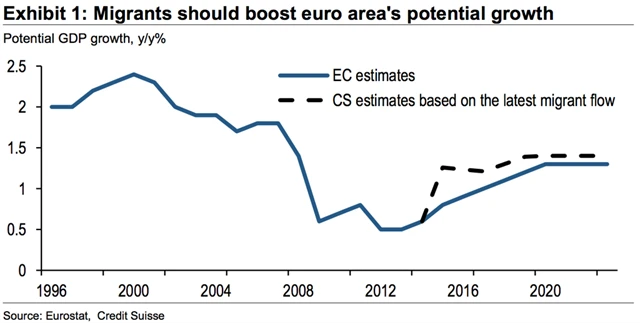 Podle Credit Suisse by příliv nové pracovní síly (zhruba tři čtvrtiny utečenců jsou v produktivním věku, navíc je mezi nimi mnoho dětí) měl vylepšit výhled růstu evropské ekonomiky o zhruba 0,2 procentního bodu, tedy na 1,3 % ročně do roku 2023.