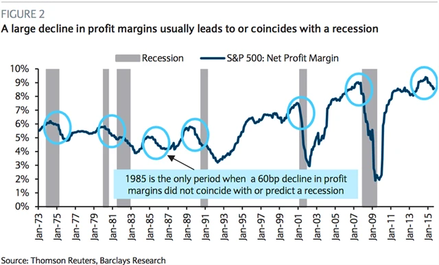 "Vztah mezi ziskovými maržemi a recesemi je silný," píše Jonathan Glionna z Barclays ve zprávě klientům. "Výsledky analýzy posledních sedmi cyklů (zpětně až do roku 1973) nejsou nijak potěšující pro ekonomiku a trhy. V každém ze sledovaných období pouze s jednou výjimkou byl pokles marží o 0,6 procentního bodu předzvěstí příchodu recese v následujících 12 měsících."