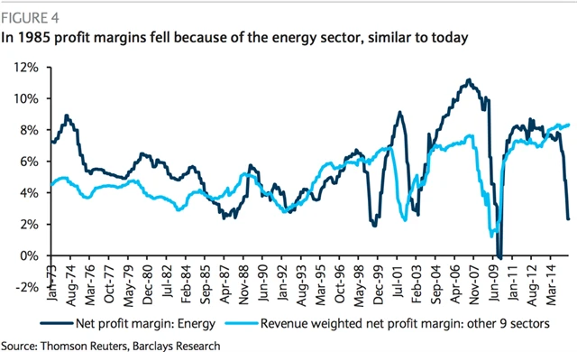 I když je proces normalizace ziskových marží obvykle spojen s recesemi, Glionna investory mírně uklidňuje s odkazem na zmiňovanou výjimku. V roce 1985 se ekonomika vyhnula recesi i přes pokles ziskových marží a dělo se tomu tak za velmi podobných tržních podmínek, jaké panují dnes. "Pokles ziskových marží byl tehdy vyvolán energetickým sektorem. V roce 1985 ziskové marže energetických firem klesly v reakci na propad cen ropy o 60 %. Mimo energetický sektor ale zůstaly marže stabilní," vysvětluje analytik. "Pokles zisků, k němuž dochází v letošním roce, je vyvolán primárně propadem marží v energetickém sektoru a opět se tak děje kvůli propadu cen ropy."