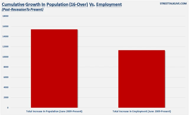 Vzhledem k tomu, že zhruba 94 milionů Američanů není bráno jako 'oficiální pracovní síla', zůstává převažujícím fenoménem tlak na snižování mezd (vlivem rostoucí poptávky po pracovních místech). A protože jednotlivci musejí nejprve vydělat na spotřebu, jsou očekávání silnějšího růstu ekonomiky ze 70 % postavená na spotřebě pesimistická i do budoucna.