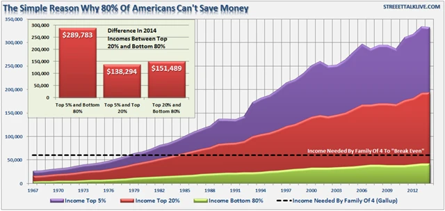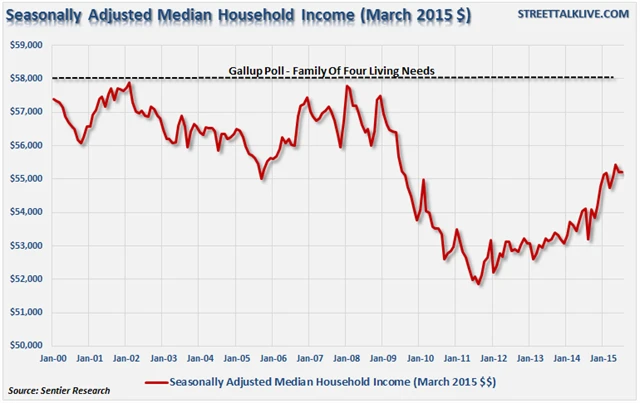 Pomalý růst platů předstihují zvyšující se reálné životní náklady (na jídlo, energie, zdravotní péči nebo vzdělání). Zužující se rozdíl mezi příjmy a výnosy vyčerpává většinu úspor domácností. Tento trend je jasně patrný v posledních statistikách amerického statistického úřadu za rok 2014, který uvádí mediánový příjem americké domácnosti jen 54 041 USD. Přitom je pro uživení čtyřčlenné rodiny v průměru zapotřebí 58 000 USD.