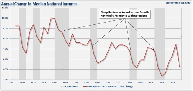 Poznámka: Graf ročního tempa změny příjmů naznačuje, že by následující recese měla přijít spíše dříve než později. Z historických zkušeností vyplývá, že když mediánový příjem vykáže prudký pokles, je to doprovázeno recesí. V roce 2014 zpomalil růst mediánu z 5,01 % na pouhých 0,56 % ročně.
