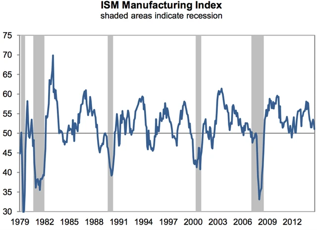 "Ve své analýze hodně spoléháme na trendy ISM vzhledem ke vztahu tohoto indikátoru k výkonnosti akciového trhu," říká Belski. "A zatímco trendy ISM za posledních 12 měsíců oslabily, úrovně zůstávají přes tři roky v pásmu expanze (50 a více bodů). Odhalili jsme, že ISM musel zpravidla spadnout daleko pod hodnotu 50, aby byl příchod recese potvrzen."