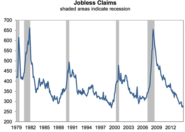 "Diskuze o pracovním trhu jsou stále v popředí zájmu trhu," doplňuje Belski. "Jeden z nejdůležitějších předstihových indikátorů pracovního trhu - žádosti o podporu v nezaměstnanosti - se nadále zlepšuje a aktuálně je na nejnižší úrovni za posledních 15 let. Počet žádostí o podporu v nezaměstnanosti běžně narůstal, když ekonomika v poválečné éře vstupovala do fáze recese."