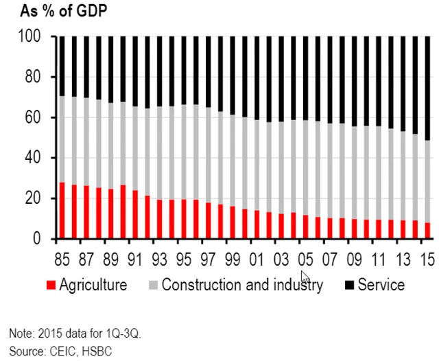 Čínská ekonomika se ale mění před očima. Svět si musí zvyknout na to, že stále větší podíl na HDP mají služby, a to právě na úkor průmyslu.