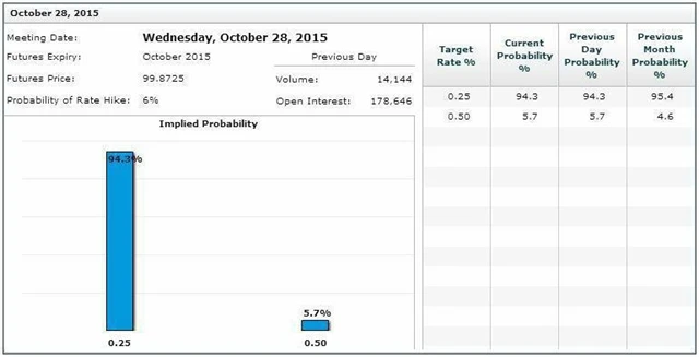 Pozornost investorů by se ale měla upínat hlavně k dvoudennímu zasedání americké centrální banky, které začne v úterý a skončí ve středu. Po konci zasedání tentokrát není naplánovaná tisková konference, což snižuje pravděpodobnost zvýšení úrokových sazeb, šéfka banky Janet Yellenová ale na druhou stranu již dříve upozornila, že naplánovaná tisková konference není nezbytná. Fed by podle ní mohl po zasedání svolat telekonferenci, během které by své případné rozhodnutí sazby zvýšit vysvětlil. Trh ale růstu sazeb v říjnu nevěří. Podle CME Group je pravděpodobnost tohoto kroku Fedu aktuálně jen 5,7 %.