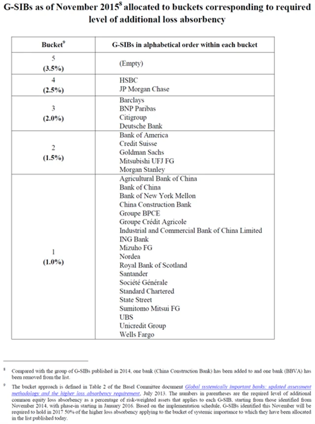 G20 proto založila Radu pro finanční stabilitu, která sestavuje seznam globálně systémově důležitých bank, které nemohou zkrachovat, aniž by to vyvolalo nákazu v celé ekonomice. Finanční instituce rada rozděluje do skupin podle významu pro globální systém a míry potřeby kapitálu na záchranu té které banky.