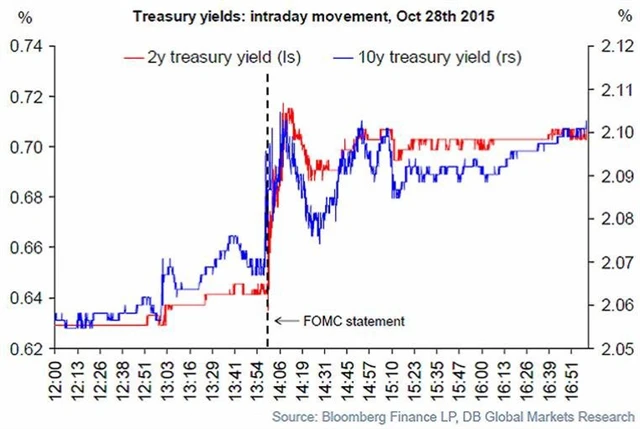 Po říjnovém zasedání FOMC, na němž bylo rozhodnuto, že základní úroková sazba prozatím zůstane na historickém minimu 0-0,25 %, přišel znatelný růst výnosů amerických vládních bondů. Trh se totiž zaměřil na jestřábí vyznění zprávy ze zasedání, která podpořila očekávání, že se sazby poprvé zvýší letos v prosinci.