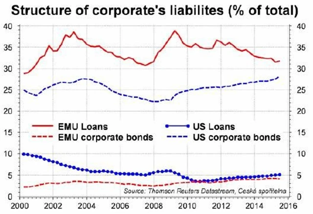 Snaha stlačit tržní výnosy dluhopisů (státních i korporátních) nebude mít v Evropě tak pozitivní dopad na ekonomiku jako v USA. Důvod je zřejmý - firmy v eurozóně si chodí pro peníze na své financování spíše do bank, zatímco ty v Americe na burzu (akcie, korporátní dluhopisy).