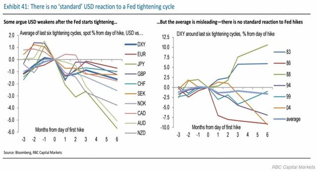 Investoři, kteří varují, že by vyšší sazby v USA mohly vystavit stopku rally dolaru, upozorňují, že v posledních šesti cyklech zvyšování sazeb v USA měna během šesti měsíců následujících po prvním zvýšení sazeb v průměru oslabila. Analytici z oddělení měnových strategií RBC Capital Markets ale tvrdí, že navzdory tomuto historickému vývoji nic jako standardní reakce dolaru na růst sazeb neexistuje.