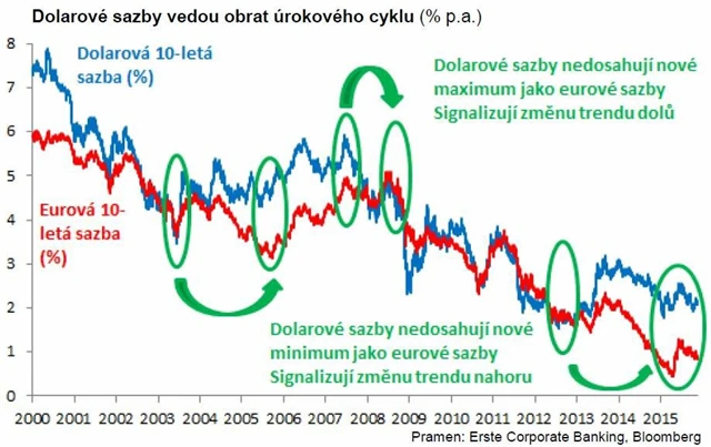 ECB ani ČNB v roce 2016 trend vývoje sazeb neotočí s pravděpodobností blížící se jistotě. I tak jsou probíhající divergence v tržních sazbách důležité, máte-li úvěry v korunách nebo eurech při pohyblivé sazbě. Neochota dlouhých eurových sazeb klesnout na nová minima spolu s ECB je varováním, že dolarové sazby opět vedou obrat globálního cyklu sazeb nahoru.