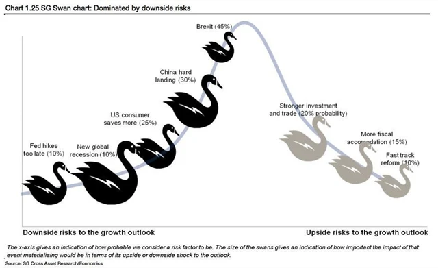 Černé labutě jsou z definice nepředvída(tel)né, pojem se ale vžil i jako označení pro možné události nebo faktory, které mohou významně ovlivnit dění ve světové ekonomice. Aktuální výhled Société Générale se příliš neliší od předchozí zprávy na toto téma, která vyšla v září.