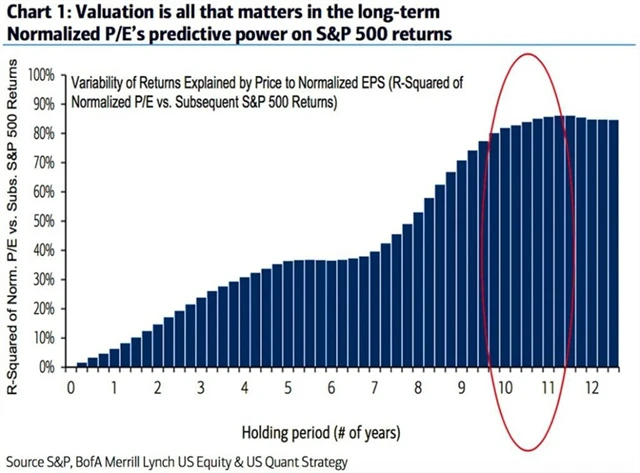 "Podle našich analýz je ukazatel P/E poměrně špatným krátkodobým indikátorem vývoje cen akcií, ale prakticky nenahraditelným v případě dlouhodobých výnosů," říká vedoucí akciových stratégů v BoAML Savita Subramanian. "Ocenění akcií historicky objasňuje 60–90 % následných výnosů v desetiletém horizontu. Ale normalizovaný (průměrný) P/E – námi preferovaný ukazatel ocenění – objasňuje až 80–90 % výnosů v následujících 10-11 letech."