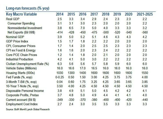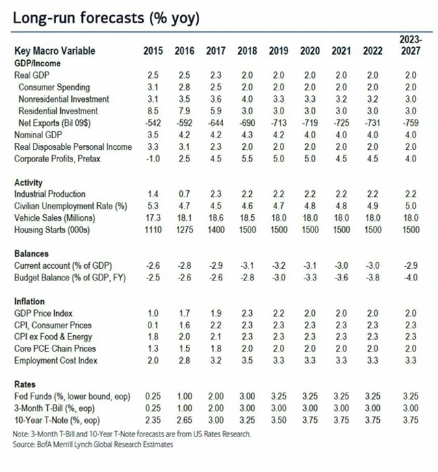 A ne dost na tom. Ethan Harris, hlavní ekonom BoAML, nabízí svůj makroekonomický výhled na příští dekádu. Za zmínku stojí, že nepředpokládá recesi v USA do roku 2027. "V tak dlouhodobém výhledu je prakticky nemožné odhadnout, kdy přijde recese, jakkoli statisticky by v tak dlouhém období nějaká přijít měla," píše k tomu lakonicky.