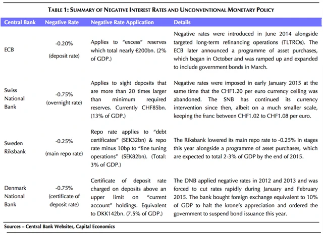 Záporné sazby centrálních bank se promítají mimo jiné i do úroků nabízených komerčními finančními ústavy. Alternative Bank Schweiz (ABS) již dokonce záporné sazby švýcarské centrální banky (SNB) začala přímo "přeúčtovávat". Běžný účet je v ABS zatížen sazbou -0,125 % a nad vklady nad 100 tisíc franků (zhruba 2,5 milionu Kč) visí sazba -0,75 %. SNB přitom předpokládá, že bude záporné úrokové sazby udržovat až do roku 2017.