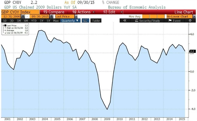 Janet Yellenová se chystá zvedat sazby, ačkoli ve třetím kvartálu 2015 dosáhl růst amerického HDP jen 2,2 %. Poslední cyklus zvýšení sazeb začal v druhém kvartálu 2004, kdy HDP rostl o 6,6 %. I v dalších z posledních případů, kdy Fed začínal s utahováním měnové politiky, se růst HDP pohyboval mezi 5 a 7 %.