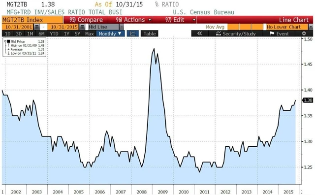Ukazatel signalizuje přebytky - prodeje klesají a zásoby narůstají. Takhle začínala každá recese.