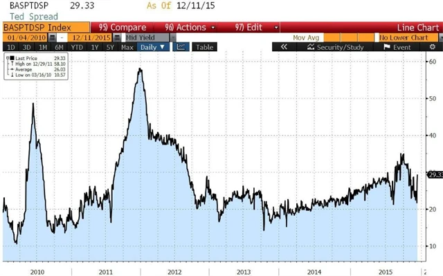 Kreditní spready se rozšiřují s tím, jak investoři unikají z korporátních dluhopisů do bezpečí dluhopisů státních. TED spread (rozdíl mezi úrokovými sazbami u mezibankovních půjček a krátkodobých amerických vládních dluhopisů) je v růstovém trendu od roku 2013. Na konci září byl nejvyšší od srpna 2012, kdy zuřila evropská dluhová krize.