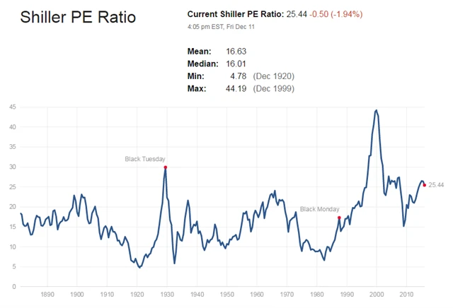 Cyklicky očištěné P/E bylo v listopadu 26,19. Hodnota nad 25 indikuje, že jsou akcie historicky nadhodnocené. V průměru bylo od roku 1881 CAPE 17.