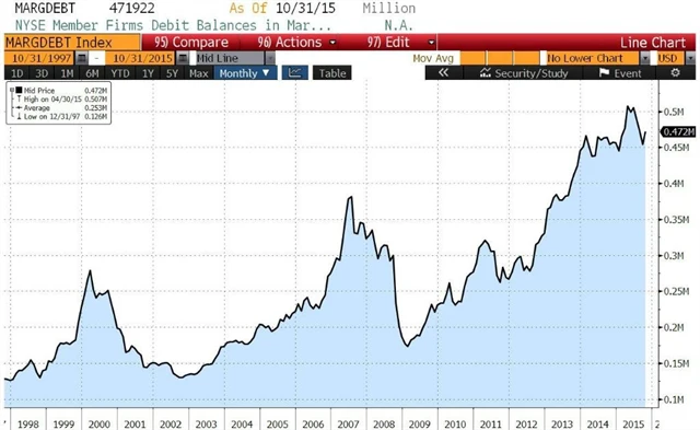 NYSE Margin Debt (půjčky obchodníků na nákupy akcií na NYSE) signalizuje vysokou "zapákovanost" trhu. Margin debt je o 20 % vyšší, než byl na vrcholu technologické bubliny.