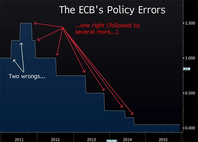 V roce 2011 světová ekonomika ještě zápasila s dopady kreditní krize, ECB se ale i tak rozhodla zvýšit úrokové sazby. Dokonce dvakrát. Jen několik měsíců po druhém utažení měnové politiky byla ale donucena zařadit zpátečku.