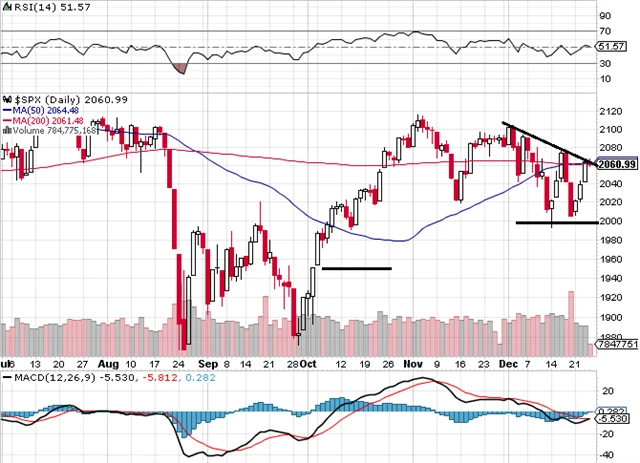 "Index S&P 500 se zastavil přesně na průsečíku 50- a 200denního klouzavého průměru a na krátkodobé klesající trendové čáře. Na grafu se tedy nic nemění, zůstává v rozpětí 2 100 až 1 990 bodů. Průlom supportu nebo rezistence napoví více o dalším směřování cen akcií. Index volatility VIX uzavřel níže než před týdnem. Oproti prvnímu pololetí je lehce výše, má ale blíže k hodnotám podporujícím pozitivní výhled pro akcie," napsal v pravidelném technickém komentáři pro Investiční web opční obchodník Josef Košťál. "Očekávaný růst se ve zkráceném obchodním týdnu nakonec dostavil. K rezistenci 2 100 má index S&P 500 stále dost daleko, nicméně se za rok 2015 dostal do mírného zisku. V roce 2011 index také uzavřel na zelené nule. Poslední letošní týden je opět zkrácený. Podle statistik by měl být ziskový (plus 1-2 %), ale loňský rok ukázal, že statistická většina má i svou menšinu, tedy že akcie mohou na konci roku i zlevňovat. Očekávám spíše stagnaci a budování obranných valů před rokem 2016."