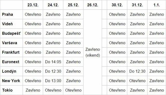 Na Silvestra zůstane většina světových trhů zavřená. V Rusku ale vyjde index nákupních manažerů ve službách, v Jižní Koreji inflace a v Řecku maloobchodní tržby. V USA bude obchodování zkrácené a vyjdou pravidelné zprávy o vývoji počtu žádostí o podporu v nezaměstnanosti a zásobách zemního plynu a dále index nákupních manažerů v oblasti Chicaga a počty aktivních ropných zařízení od společnosti Baker Hughes.