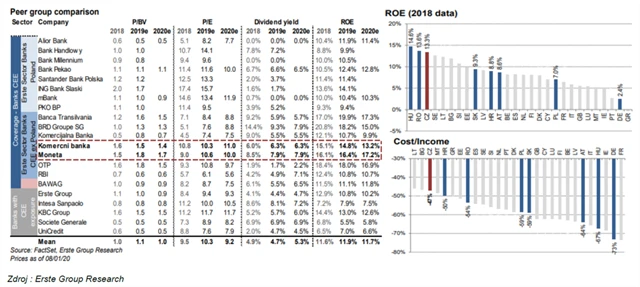 Od Komerční banky Erste očekává silné výsledky za rok 2019 (i díky rozpouštění opravných položek), ale zisky v roce 2020 odhaduje na nižší úrovni z důvodů nárůstu těchto opravných položek. Proto v nejbližší době neočekává výraznější růst ceny akcií KB, nicméně kvalitu zisků považuje za solidní a trhem podhodnocenou. ROE na úrovni 12-13 % není ve srovnání s konkurenty nejsilnější, ale vychází ze silné kapitálové základny. Dividenda zůstává atraktivní (výnos okolo 6,3 %).