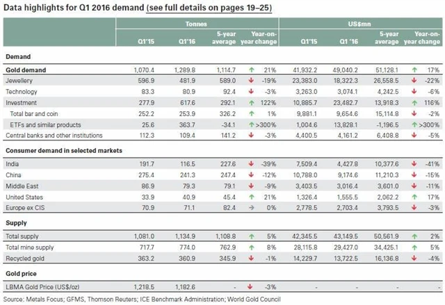 Světová poptávka po zlatě v prvních třech měsících letošního roku stoupla meziročně o 21 % na 1 289,8 tuny, a dostala se tak na historicky nejvyšší úroveň. Zájem byl kvůli nejistému ekonomickému výhledu především o investiční zlato, naopak poptávka po kovu pro šperkařskou výrobu kvůli růstu jeho ceny a zvýšení daní v Indii klesla. Vyplývá to ze čtvrtletní analýzy Světové rady pro zlato (World Gold Council, WGC). Nepatrně zpomalily také nákupy kovu ze strany centrálních bank.