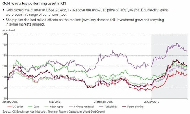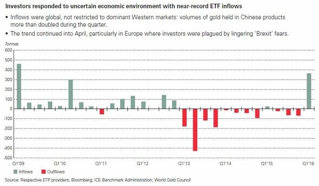 Prudký nárůst poptávky po takzvaných zlatých ETF je podle WGC reakcí investorů na složité ekonomické prostředí a nejistotu ohledně dalšího vývoje světového hospodářství. V dubnu podle WGC zájem o zlaté ETF pokračoval a byl podporován mimo jiné nejasným výsledkem červnového referenda o vystoupení Spojeného království z Evropské unie.