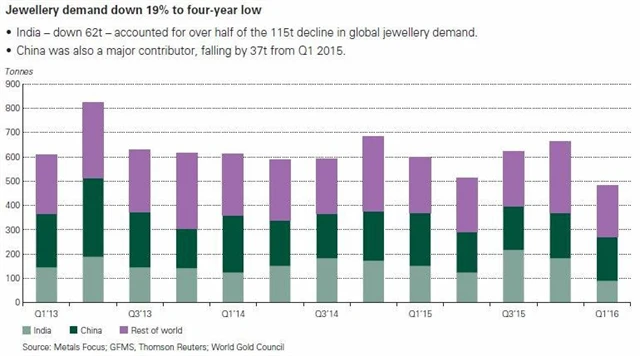 Poptávka po kovu na výrobu šperků v prvním čtvrtletí letošního roku klesla na čtyřleté minimum. Slabší zájem byl důsledkem růstu ceny kovu a negativně na poptávku působily rovněž vyšší daně v Indii, na které je tento trh velice citlivý. Výhled pro Indii je nicméně podle WGC příznivý, tamní spotřebitelé čekají na vhodnou příležitost k obnovení nákupů zlatých šperků, která se podle WGC blíží s tím, jak se postupně snižují ceny kovu na lokálních trzích.