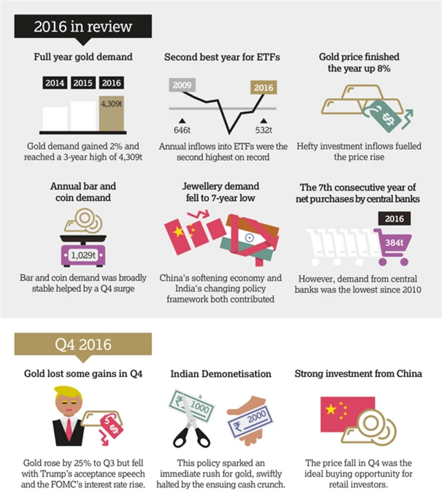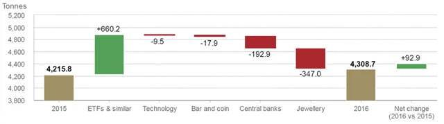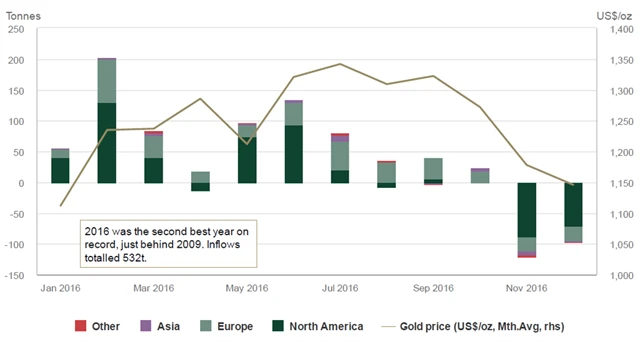 Pro burzovně obchodované fondy (ETF) investující do žlutého kovu byl rok 2016 z pohledu zájmu investorů historicky druhý nejlepší. Světová poptávka po zlatě prostřednictvím těchto instrumentů loni dosáhla 531,9 tuny, vyšší hodnoty poptávka dosáhla jen v roce 2009. V posledním loňském čtvrtletí se ale investoři ze zlatých ETF stahovali.