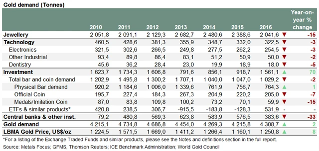 Opačný vývoj byl patrný u poptávky po zlatých mincích a slitcích. Zatímco po většinu roku 2016 byla poptávka po žlutém kovu v této podobě vlažná, ve čtvrtém čtvrtletí ožila. Lidé se v závěru roku k nákupům mincí a slitků vrátili hlavně s ohledem na vývoj ceny kovu. Celkově loni investice do zlatých mincí a slitků klesly o dvě procenta, ve Spojeném království ale vyskočily o 28 % na téměř 11 tun. Britové mince a slitky kupovali poté, co se v červnovém referendu vyslovili pro odchod své země z Evropské unie, což výrazně oslabilo britskou libru a zvýšilo obavy z prudkého růstu inflace.