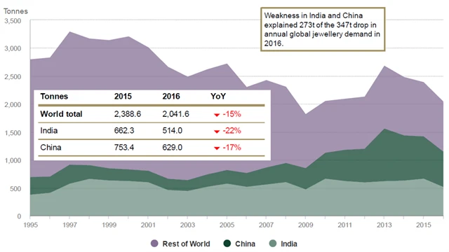 Výrazně utlumená byla v loňském roce poptávka po žlutém kovu ve šperkařském průmyslu, a to především kvůli vývoji ceny zlata v prvních třech čtvrtletích roku, dění v Indii a pokračujícímu zpomalování růstu čínské ekonomiky. V Indii zájem o kov v závěru roku oslabilo nečekané stažení některých bankovek z oběhu v rámci protikorupčního boje a s tím spojené problémy spotřebitelů kvůli nedostupnosti hotovosti. Poptávka po zlatých špercích byla v Indii meziročně nižší o 22 % a v Číně klesla o 17 %.