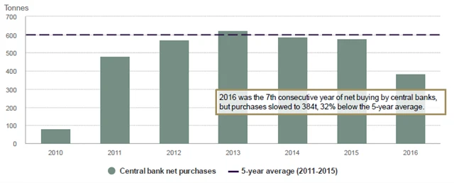 Poptávka po zlatě ze strany centrálních bank byla loni nejslabší od roku 2010. Čisté nákupy zlata ze strany centrálních bank na úrovni 383,6 tuny byly meziročně nižší o 33 %, rok 2016 byl ale již sedmým rokem v řadě, kdy centrální banky celkově více zlata koupily, než prodaly.