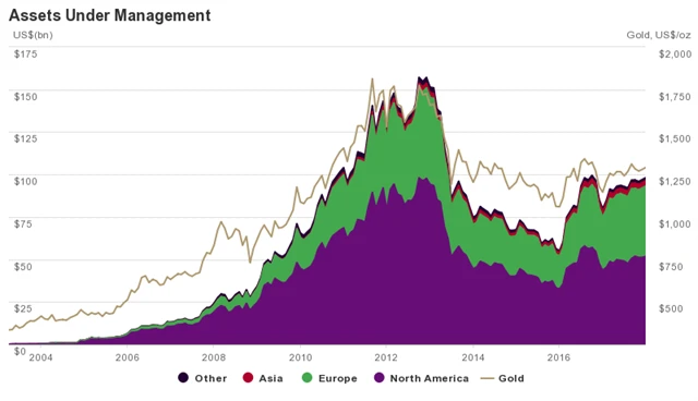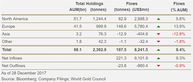 V samotném prosinci se hodnota investic ve zlatých fondech zvýšila o zhruba 101 milionů USD (ekvivalent 5,3 tuny), přičemž zájem o kov projevovali investoři v Evropě (+46 milionů USD), Severní Americe (+40 milionů USD) i Asii (+56 milionů USD). Ve zbytku světa byl zaznamenán odliv prostředků v hodnotě 41 milionů USD.